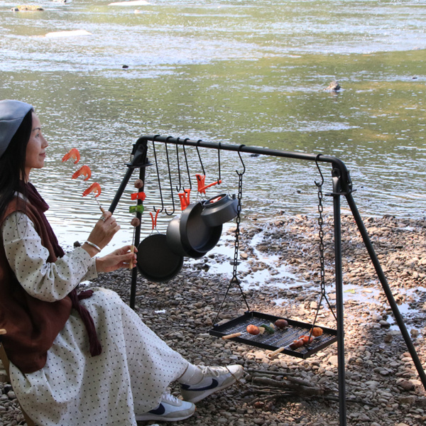 4 EASY TO USE: Outdoor cooking equipment can be easily set up, six hooks can hold grilling tools. Features a stable A-frame construction, suitable for a variety of terrains such as beaches, grass, slopes, etc., and can also be used in the backyard.